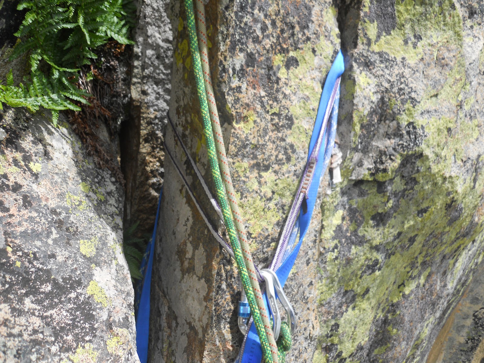 Descenso:rappel , el primero de un árbol coincide con la R2, y el segundo de un descuelgue situado en la roca del flanco derecho.